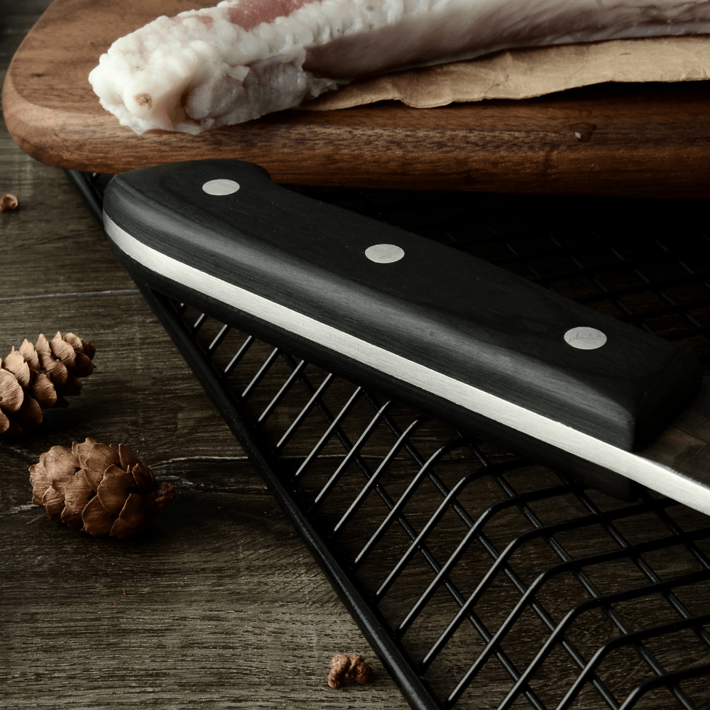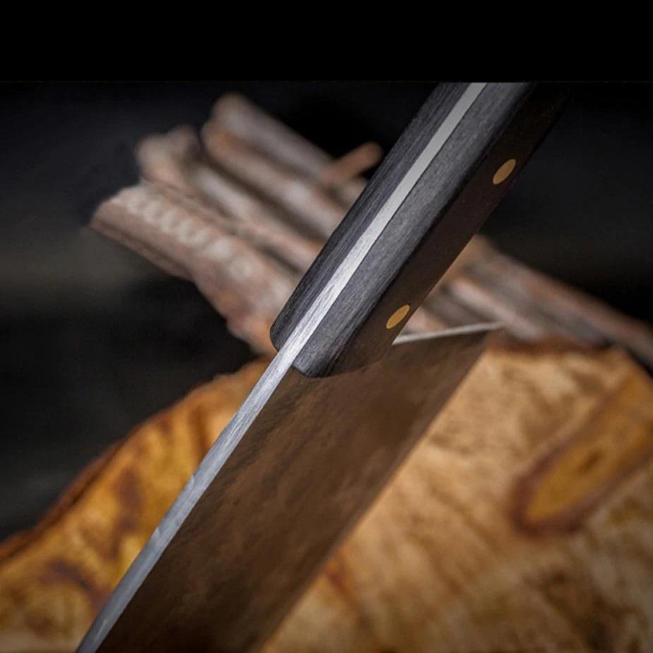 Each Desconi™ Blade is forged through true hammer quenched tempering methods at 1950° F before being perfectly honed to a 12° double bevel edge using a traditional hataki whetstone grinding wheel. This process creates unparalleled sharpness and hardness in every blade. Exquisitely finished with hand selected onyx cherry wood and brushed copper rivets to create the ultimate handling experience.